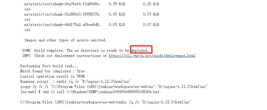 xcopy /y /e /i "C:\Program Files (x86)\Jenkins\workspace\ns-web\ns" "E:\nginx-1.12.2\html\ns"