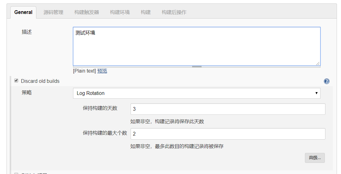 4.输入项目名称,进入到项目之后,进行项目的描述已经配置下discard old builds,这个是配置项目构建保留的天数和最大个数,为了给磁盘省点空间,不然每次构建都有存留很多的历史文件。