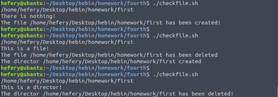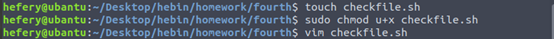 在目录 /Desktop/hebin/homework/fourth 下创建文件checkfile.sh,并赋予可读、可写、可执行的权限