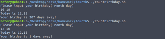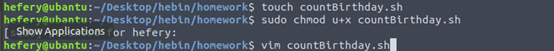 在目录 /Desktop/hebin/homework/fourth 下创建文件countbriday.sh,并赋予可读、可写、可执行的权限