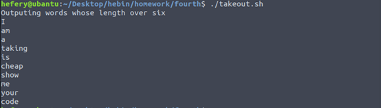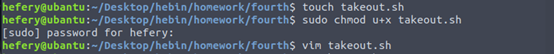 在目录 /Desktop/hebin/homework/fourth 下创建文件takeout.sh,并赋予可读、可写、可执行的权限