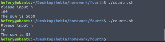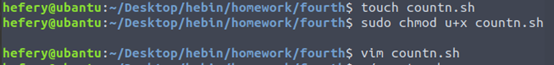 在目录在目录 /Desktop/hebin/homework/fourth 下创建文件countn.sh,并赋予可读、可写、可执行的权限