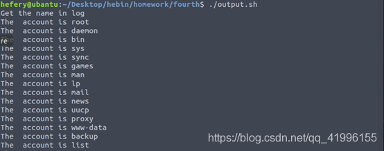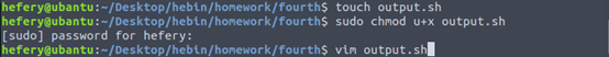在目录在目录 /Desktop/hebin/homework/fourth 下创建文件output.sh,并赋予可读、可写、可执行的权限