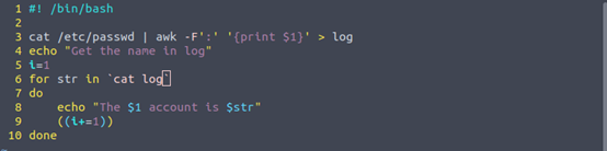 - 可将/etc/passwd的第一栏取出,并且每一栏都已一行字符串“The n account is uname”,n为行数。