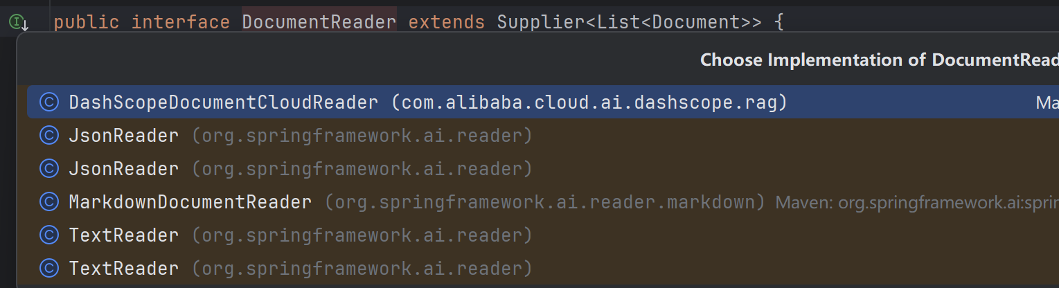 Spring AI目前实现了六个Reader,都是基于Document类进行实现的。