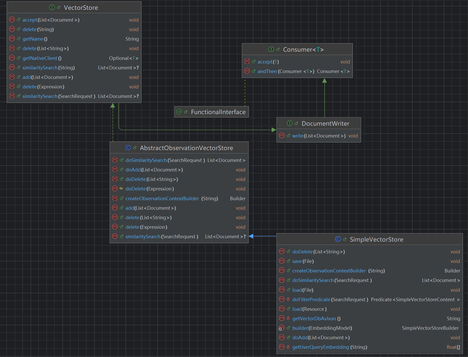 SimpleVectorStore 实现了 VectorStore 接口,而 VectorStore 接口集成了 DocumentWriter,所以具备文档写入能力。