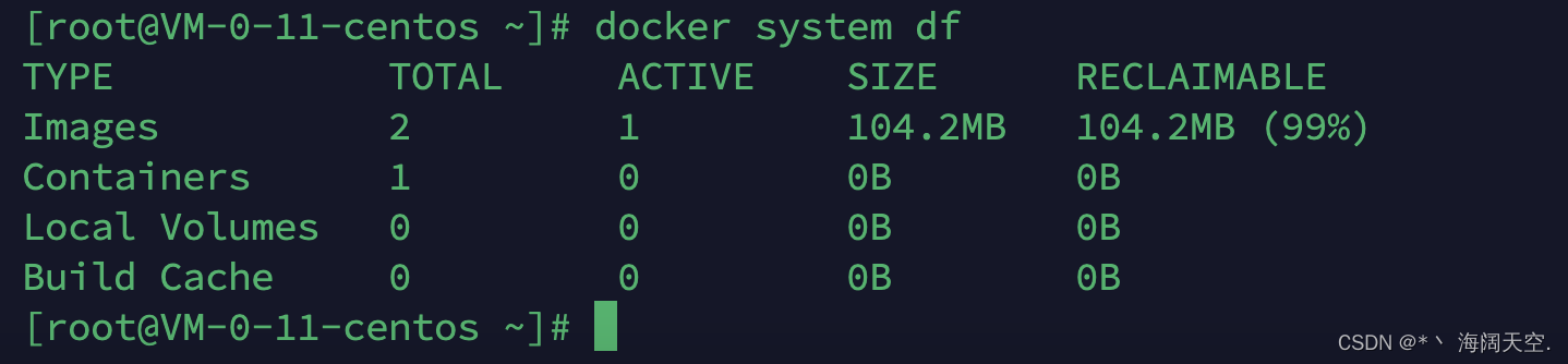- docker system df 查看镜像/容器/数据卷所占的空间