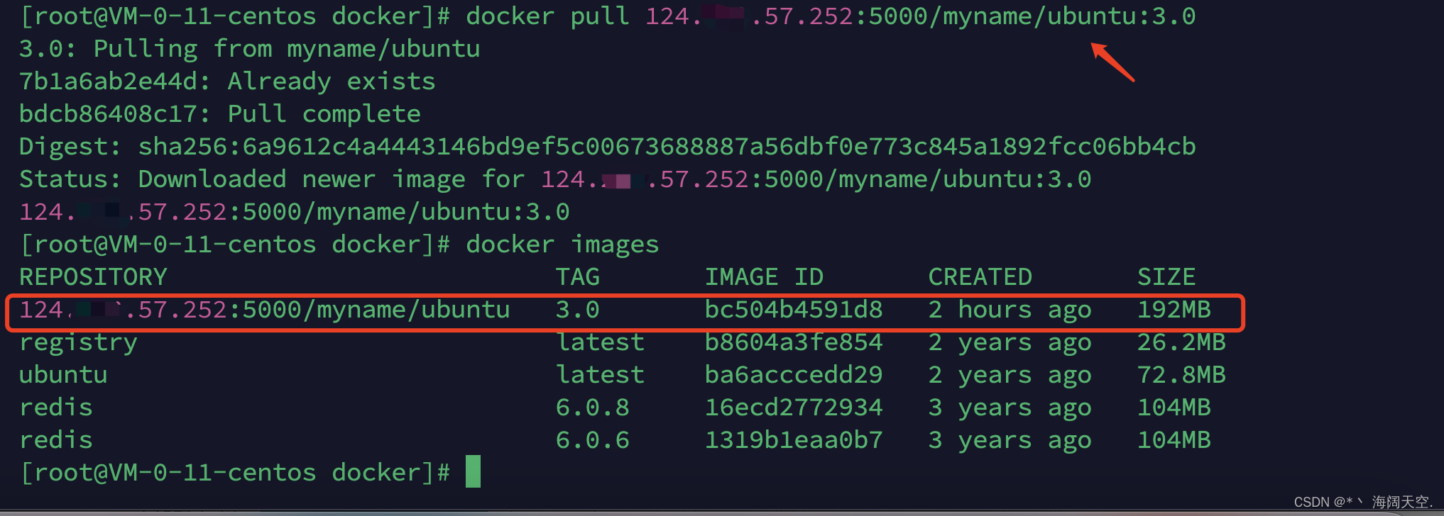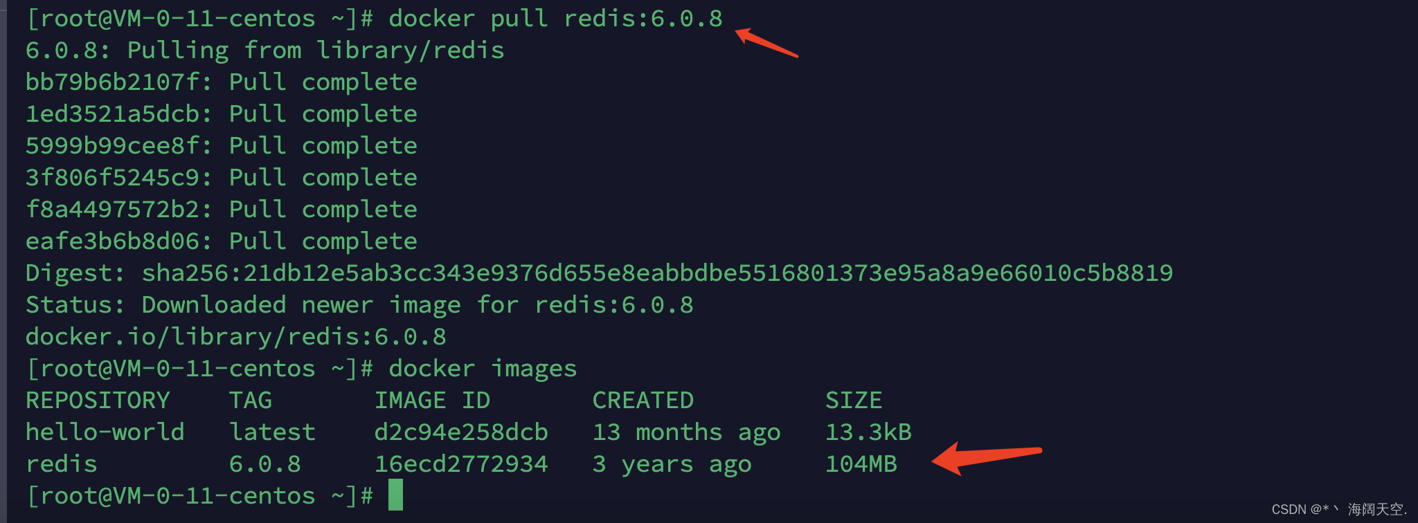 - docker pull 某个镜像名字[:TAG] 拉取某个镜像加版本号