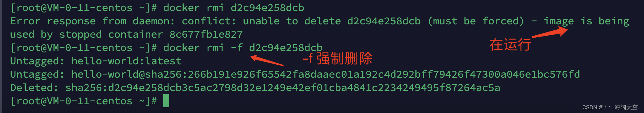 - docker rmi -f 某个镜像名字id 强制删除某个镜像