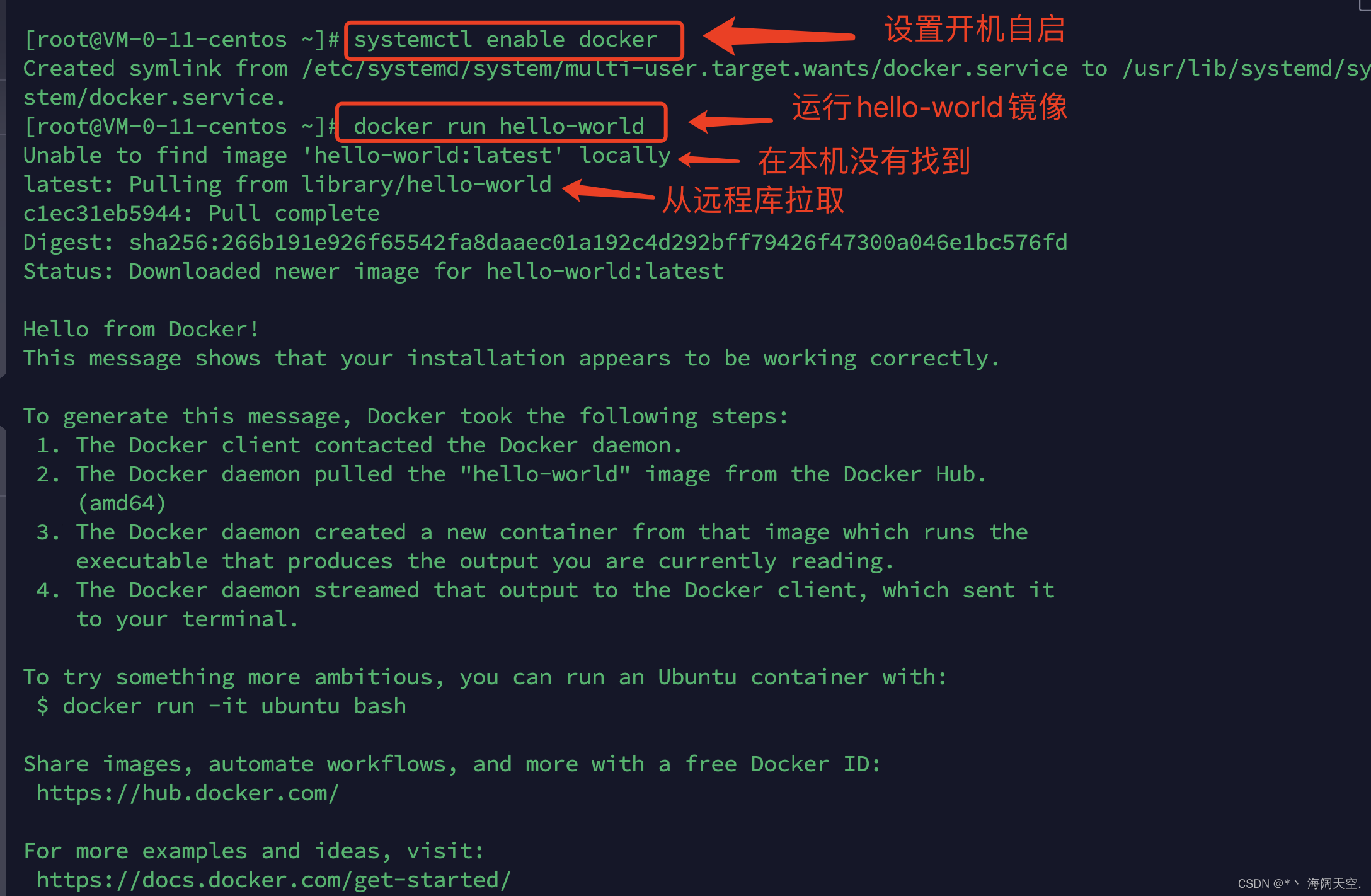 - 通过运行helloworld镜像验证docker引擎安装是否成功