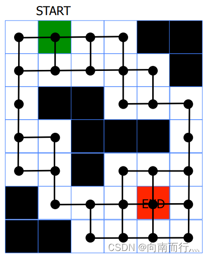 我们先从最简单的栅格图开始看起,在这里机器人被限制仅能在网格单元上向着东南西北方向相邻的格子进行移动,其中黑色的部分是障碍物。