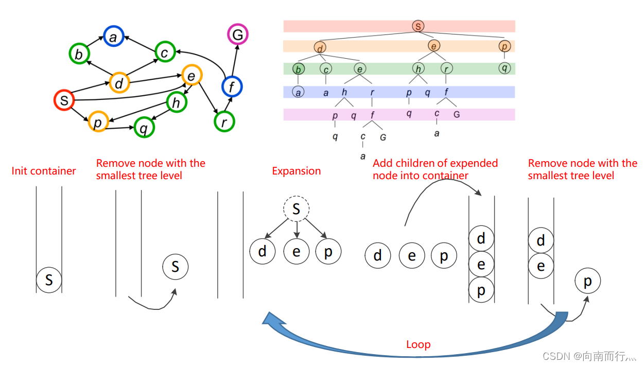 更直观的图如下,其实这本质上是一个广度优先(BFS)算法,初始化的时候每个节点的距离标记为Ifinity,然后把目标节点标记为0,然后放到空列表(这个列表本质上是一个队列,遵循先进先出原则)里,然后开始进入循环。在循环里,弹出列表中的第一个节点,然后找与该节点中相邻的其它节点,如果这个节点的距离不是为Ifinity,将其标记成弹出节点的距离+1,然后放进列表中。直到列表为空。