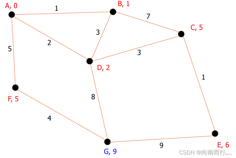 下一轮访问节点 F ,因为节点 F 是比较先进入列表里的。它会发现一条途经节点 F 抵达节点 G 的更短的路径,于是我们可以对节点 G 的距离进行更新为 9,其上一个节点更新为 F。最后访问节点 C,我们就会发现目标点 E,到此路径搜索结束,我们找到了一条从 A 到 E 的最优路径:A->D->C->E。