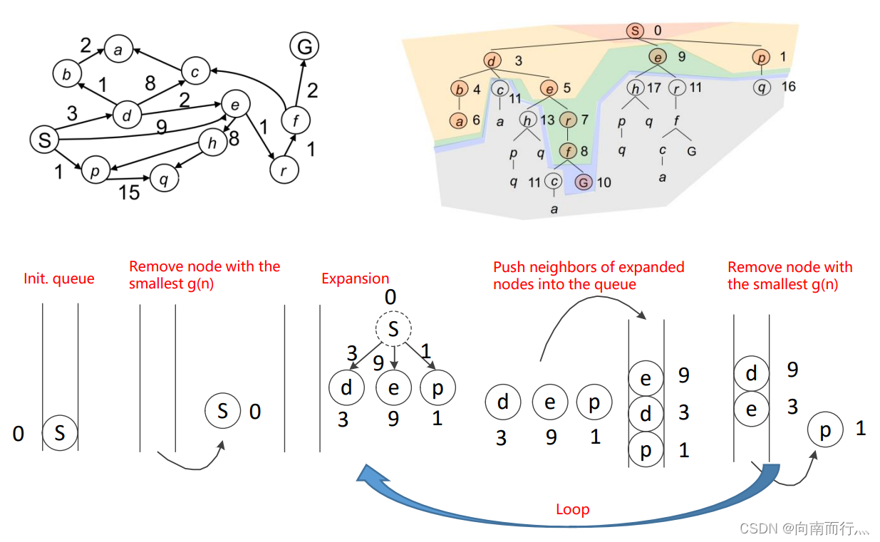 下图是更形象地描述了 Dijkstra 算法,其中最重要的是放置节点的列表采用了优先队列,也就是说,列表中存储节点的时候列表会自动按距离值从小到大排序这些节点,使其在下一轮迭代时能选择当前距离值最小的节点,其优先队列如何实现其实网上有很多种方法,不同编程语言也有不同的实现手段,这里不再赘述。