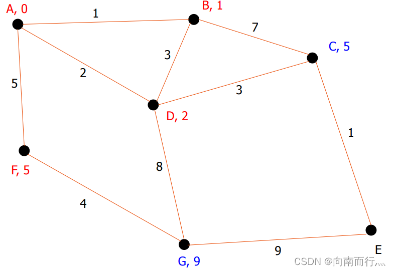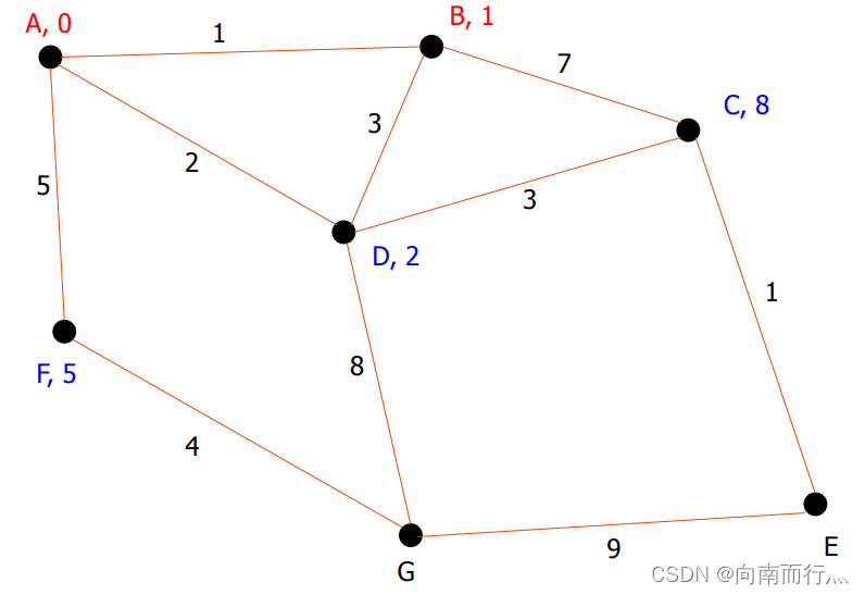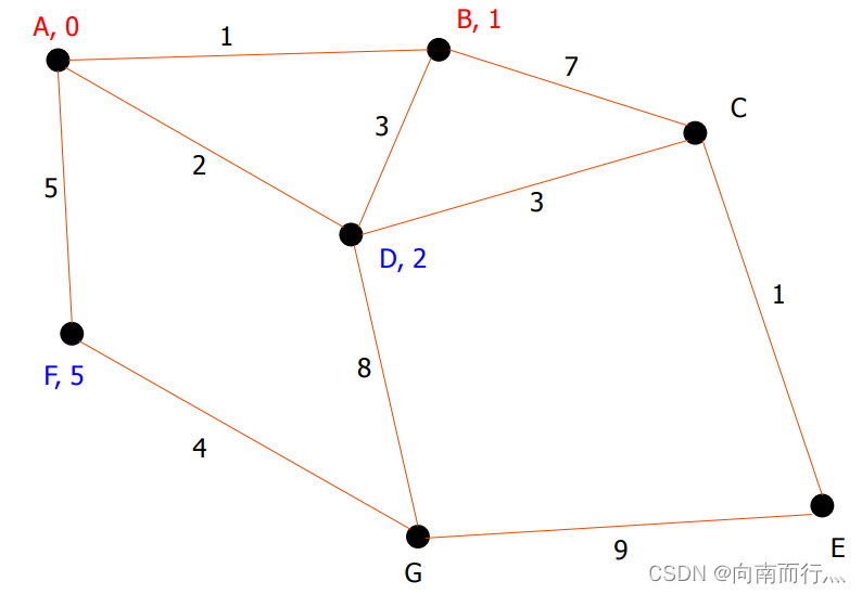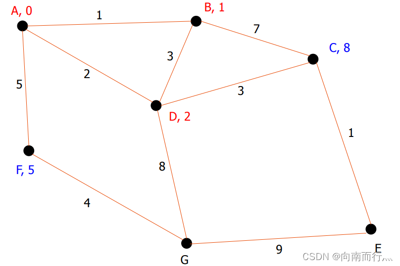 访问完节点 B 后, 我们将会访问节点 D。我们会发现一条途经节点 D 抵达节点 C 的更短的路径, 于是我们可以对节点 C 的距离进行更新为 5,并把 G 的上一个节点修改成 D 以及标注成蓝色。