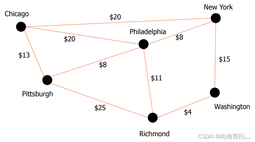 比如下图对应的是城市之间的收费公路,我们感兴趣的点也许是在不同城市之间找到最少花费的路径规划,其中每个节点(城市)之间边的属性代表城市之间公路的通行需要支付的费用。其中边的属性, 其将与代价或距离最小化问题相关。