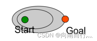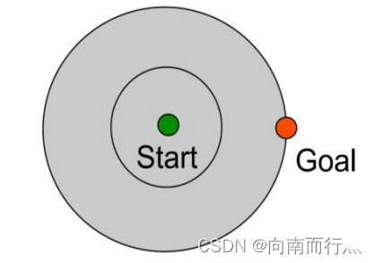 Grassfire 算法 和 Dijkstra 算法实际上都能找到存在的最短路径, 而当路径不存在时,它们识别并报告。 但是这类算法都是一种无目的的,它们搜索过程中都会从起始节点向外围均匀发散,直至找到目标点,如下图所示: