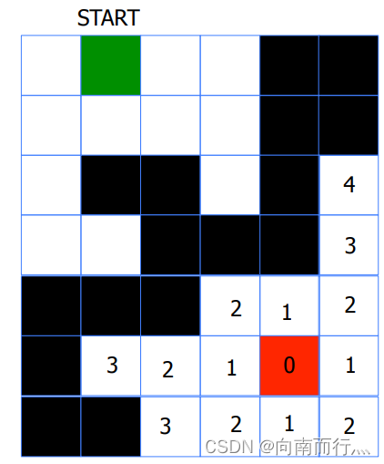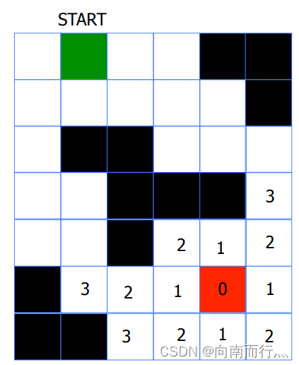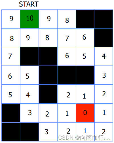 首先在目标点上标记距离为0,下一步,我们将找到所有距离 目的地仅 1 步之遥的所有节点, 并将他们标记上一个数字 1。 再下一步,所有的 2 步之遥的 节点都标记上一个 2。 所有的节点有 3 步之遥的, 都标记上一个 3,以此类推。 直到抵达起始节点: