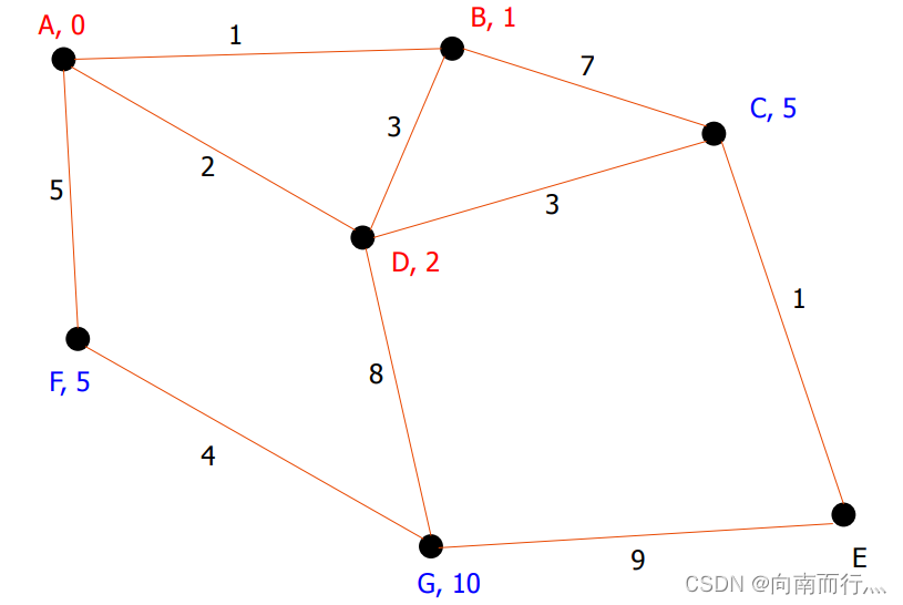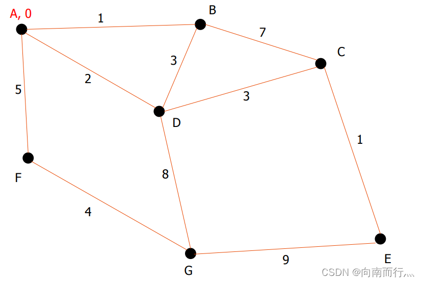 让我们考虑一个从某村庄到另一村庄的问题。用图来对这个问题进行建模,各个节点来代表不同的村庄, 而各边代表村庄之间的道路。不同边分别对应不同的数字, 这些数字代表道路的距离。 我们的目标是找到图上从节点 A 到节点 E 的最短路径: