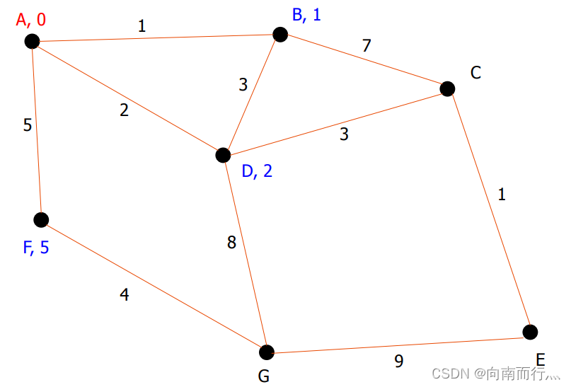 刚开始的时候,我们用距离值 0 对起始节点进行标记。 红色代表这个节点已经被访问或标记过了。 随后,对于节点 A 相邻的各节点进行标记, 标记的时候我们会计算它们的距离值,并且记录下它们上一个节点,方便找到目标点后追踪回去。在这个例子中,相邻的就是节点 B、D 和 F,其上一个节点就是 A 。蓝色代表访问过的节点的相邻节点。
