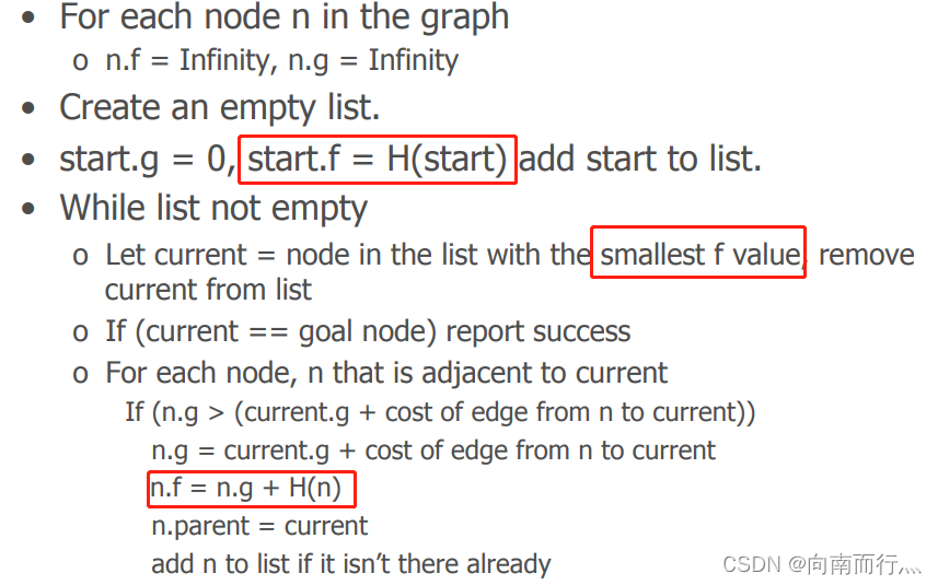 其伪代码的形式如下,其中与 Dijkstra 算法的区别我已经用红色方框标注了出来,最明显的区别就是列表是以 f 值从小到大排序的,f 值就是距离值加上到启发式函数(目标点的估计距离值相加)。这样做的话我们就会优先探索离目标点近的节点,从而更快找到路径。