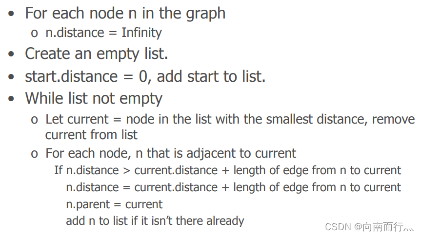 其伪代码的形式与Grassfire 算法相差不大,只是节点的距离值的更新由于引入了边的权重所以不再是加一而是边的权重(节点间的距离)。并且节点引入了父节点的属性方便追溯。