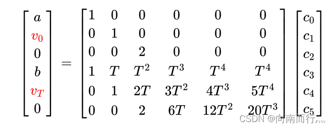 通过将 t=0, t=T代入到上面的多项式,以及多项式的一阶求导,二阶求导可得: