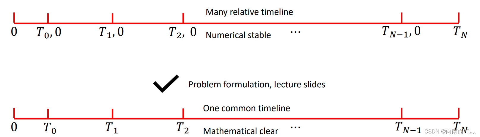 我们选择下图上方的 T 描述方式,也就是第二段轨迹的起始时刻为 0 ,这样计算起来数值比较稳定,解得更快。