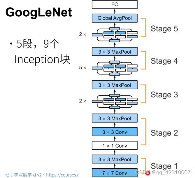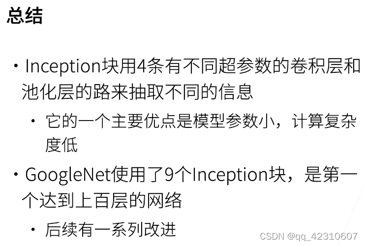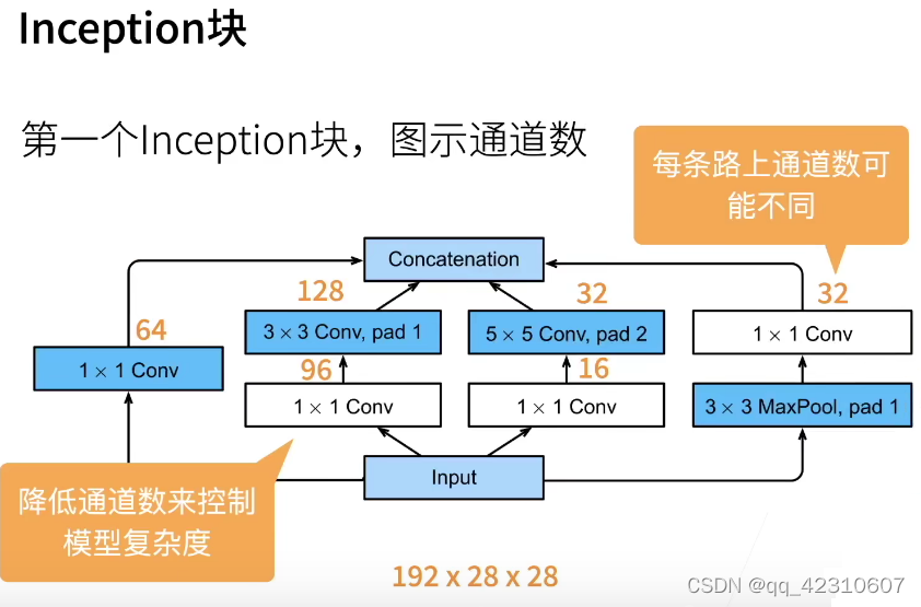 该博客介绍了一个名为Inception的网络模块,它包含4条不同的信息抽取路径:1x1卷积、1x1卷积后接3x3卷积、1x1卷积后接5x5卷积以及3x3最大池化后接1x1卷积。这些路径的输出在通道维度上被连接起来。随后展示了网络结构,包括多个阶段的卷积和池化层,最后通过全连接层得到分类结果。整个网络应用于FashionMNIST数据集的训练和测试。