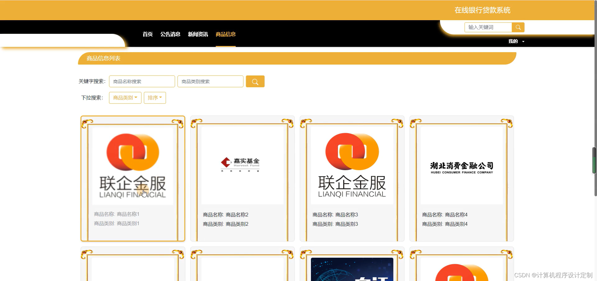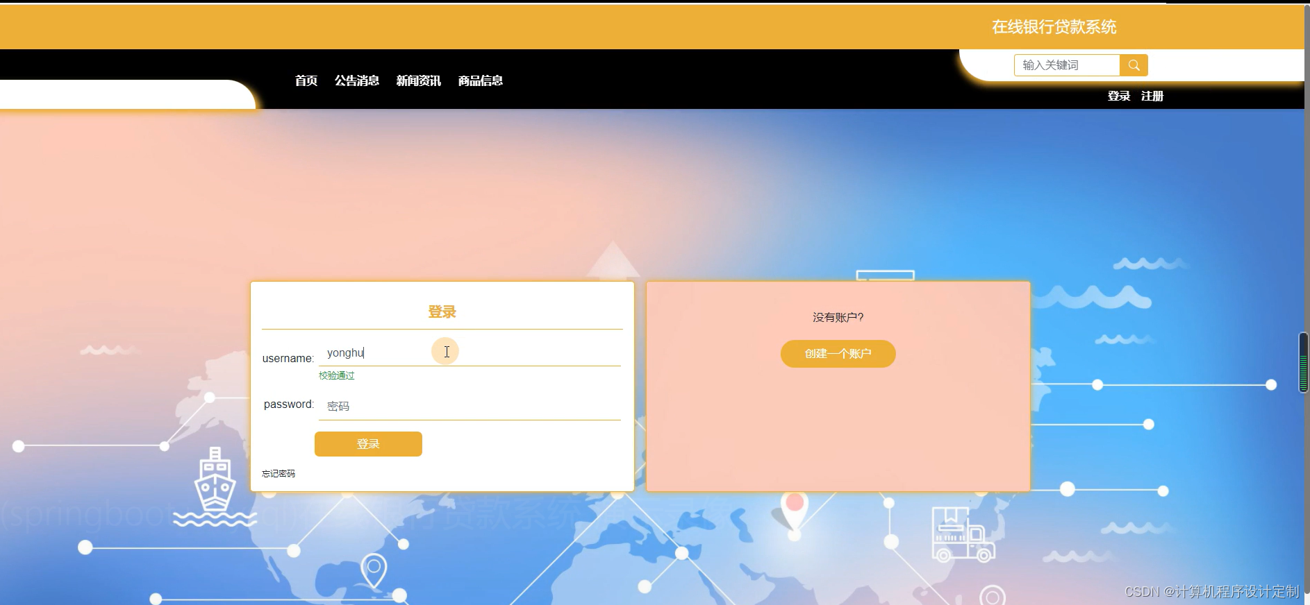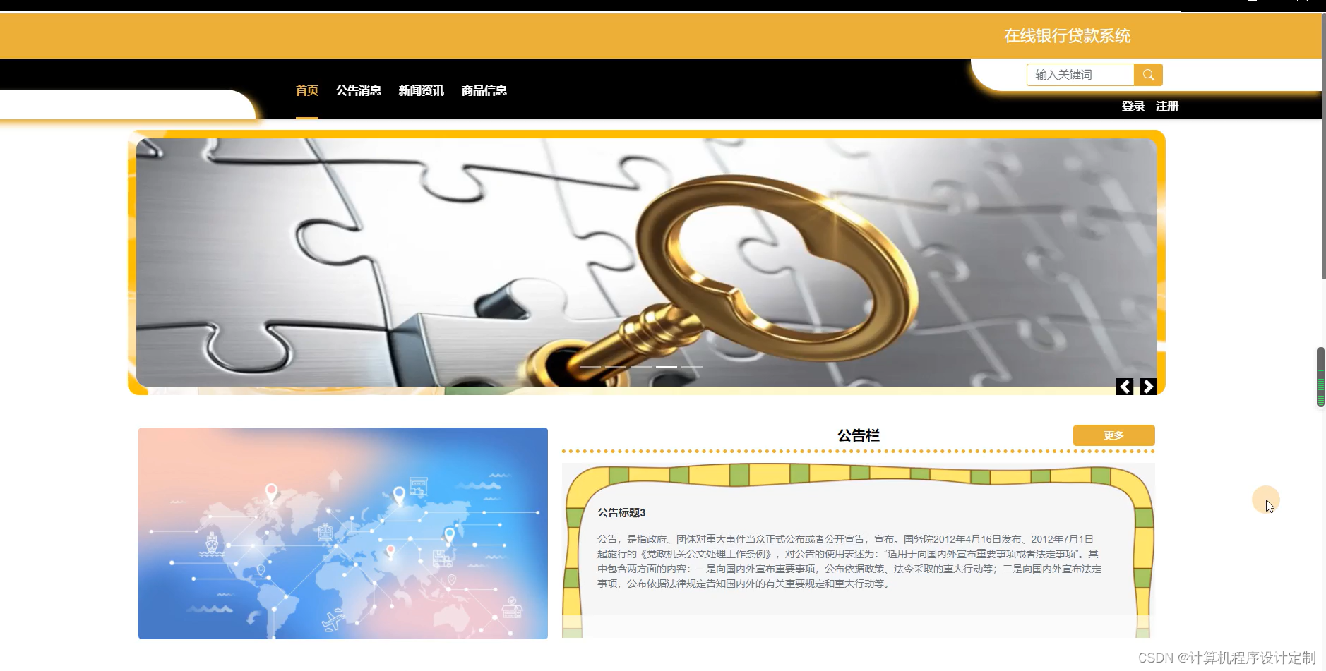 在线银行贷款系统,在系统首页可以查看首页、公告消息、新闻资讯、商品信息、后台管理等内容,如图5-1所示。