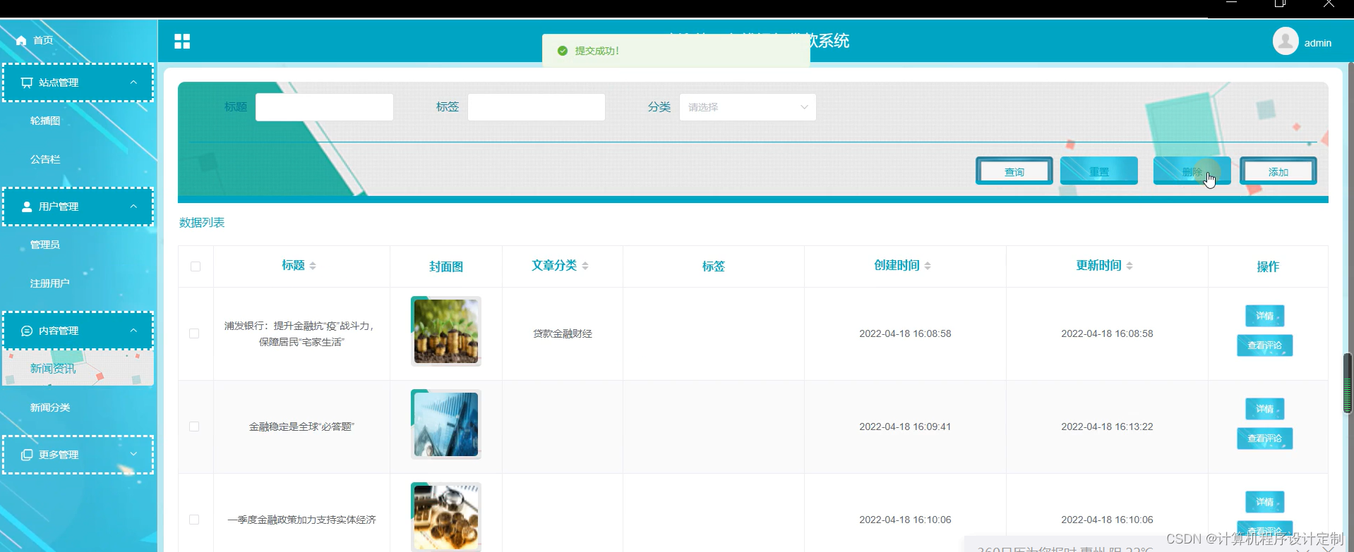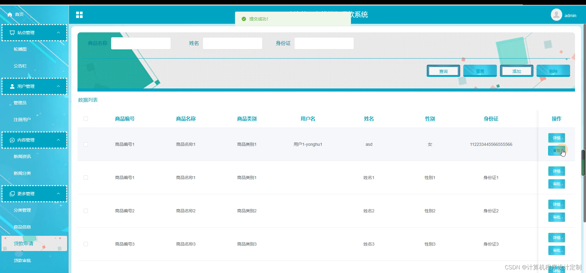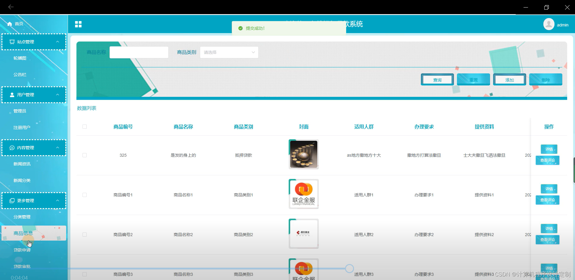 管理员登录进入在线银行贷款系统可以查看首页、站点管理(轮播图、公告栏)用户管理(管理员、注册用户)内容管理(新闻资讯、新闻分类)更多管理(分类管理、商品信息、贷款申请、贷款审批、贷款订单)系统管理等信息。