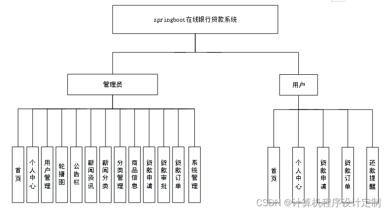 本在线银行贷款系统主要包括三大功能模块,即客户经理功能模块、管理员功能模块和用户功能模块。