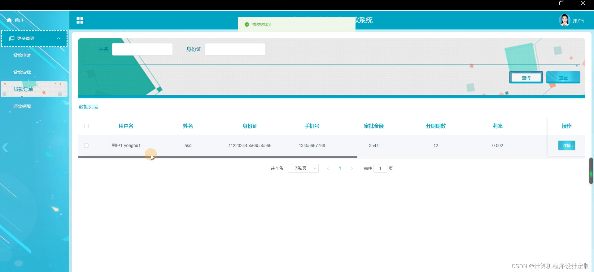 The use of this system can realize the informatization of online bank loan system management and facilitate the administrator to manage more conveniently and quickly.