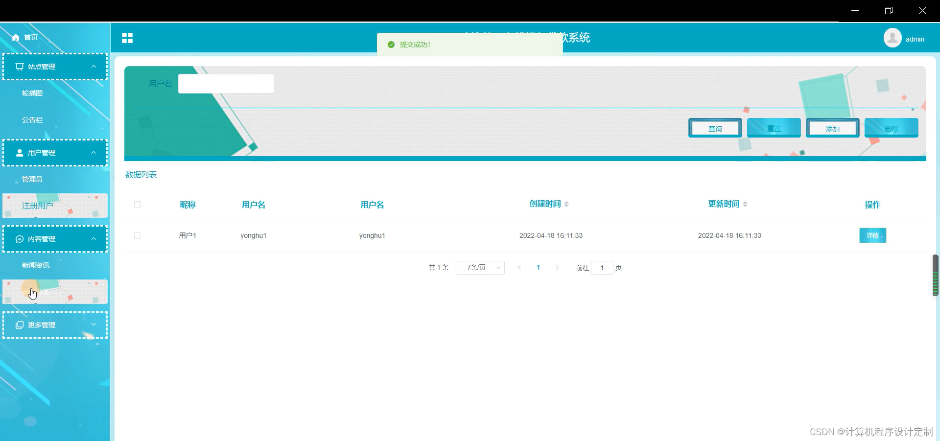 用户管理,在用户管理页面中可以通过填写用户名、昵称、姓名、年龄、性别、手机、邮箱、身份证等内容进行修改、删除,如图5-6所示。还可以根据需要对新闻资讯管理进行详情,修改或删除等详细操作,如图5-7所示。