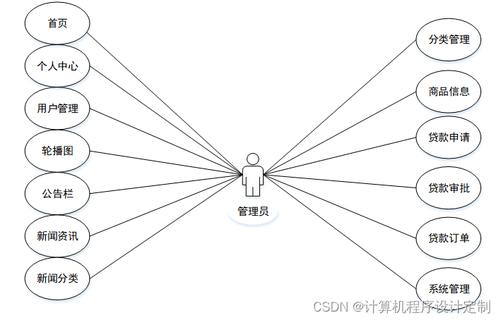 (1)管理员模块:系统中的核心用户是管理员,管理员登录后,通过管理员功能来管理后台系统。主要功能有:首页、站点管理(轮播图、公告栏)用户管理(管理员、注册用户)内容管理(新闻资讯、新闻分类)更多管理(分类管理、商品信息、贷款申请、贷款审批、贷款订单)系统管理等功能。管理员用例图如图3-1所示。