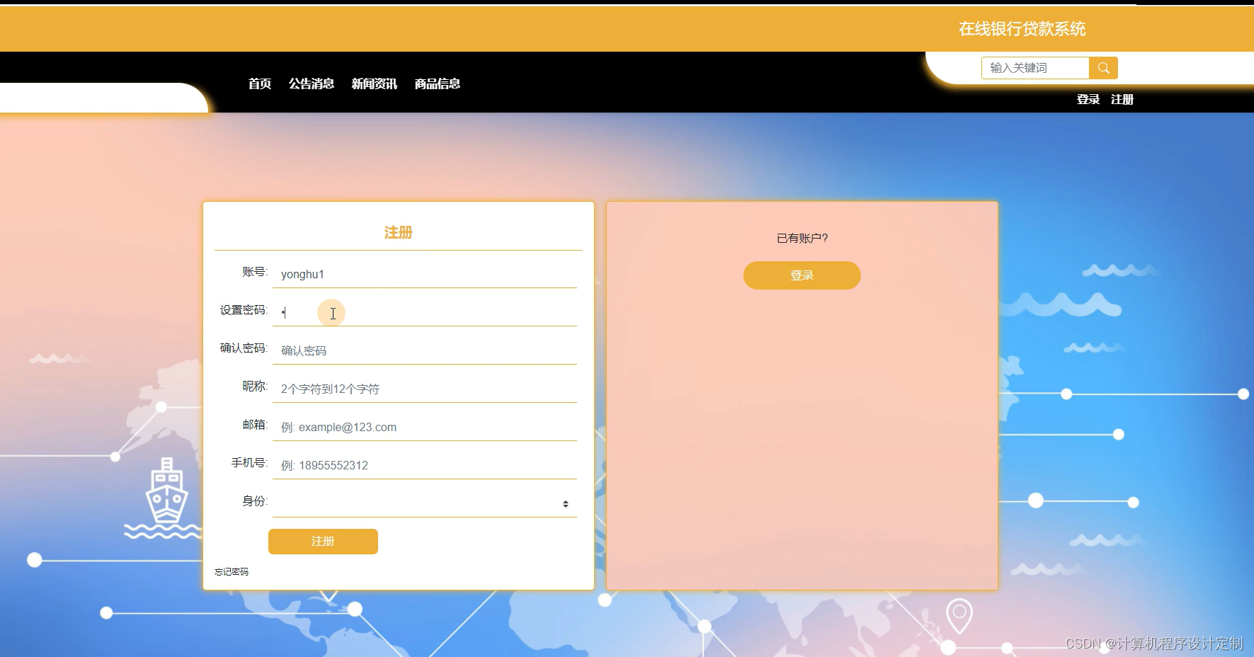 在线银行贷款系统的主要使用者分为管理员和用户,实现功能包括管理员:首页、站点管理(轮播图、公告栏)用户管理(管理员、注册用户)内容管理(新闻资讯、新闻分类)更多管理(分类管理、商品信息、贷款申请、贷款审批、贷款订单)系统管理,用户;首页、贷款申请、贷款订单、还款提醒。前台首页;首页、公告消息、新闻资讯、商品信息、个人中心、后台管理等功能。由于本网站的功能模块设计比较全面,所以使得整个在线银行贷款系统信息管理的过程得以实现。