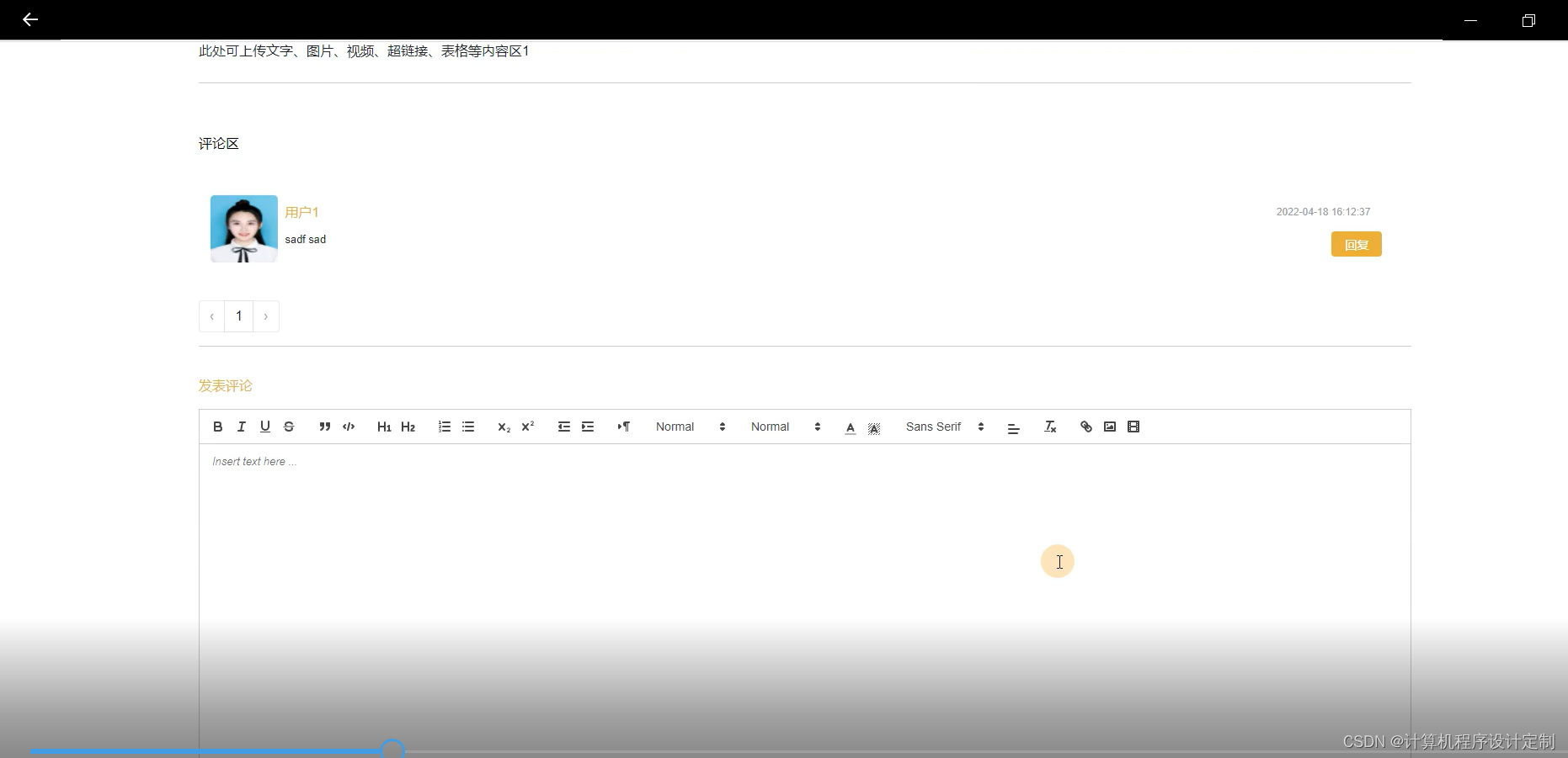 银行商品,在银行商品页面通过填写商品编号、商品名称、商品类型、图片、等信息进行购买,如图5-3所示。在用户评论页面通过填写内容等信息进行立即提交操作,如图5-4所示。