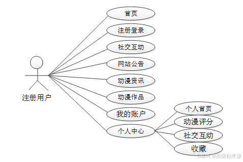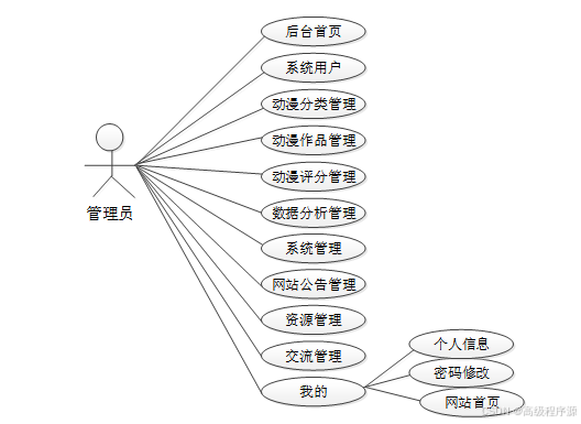 通过2.3功能的分析,得出了本基于SSM+VUE动漫展示系统的角色用例图: