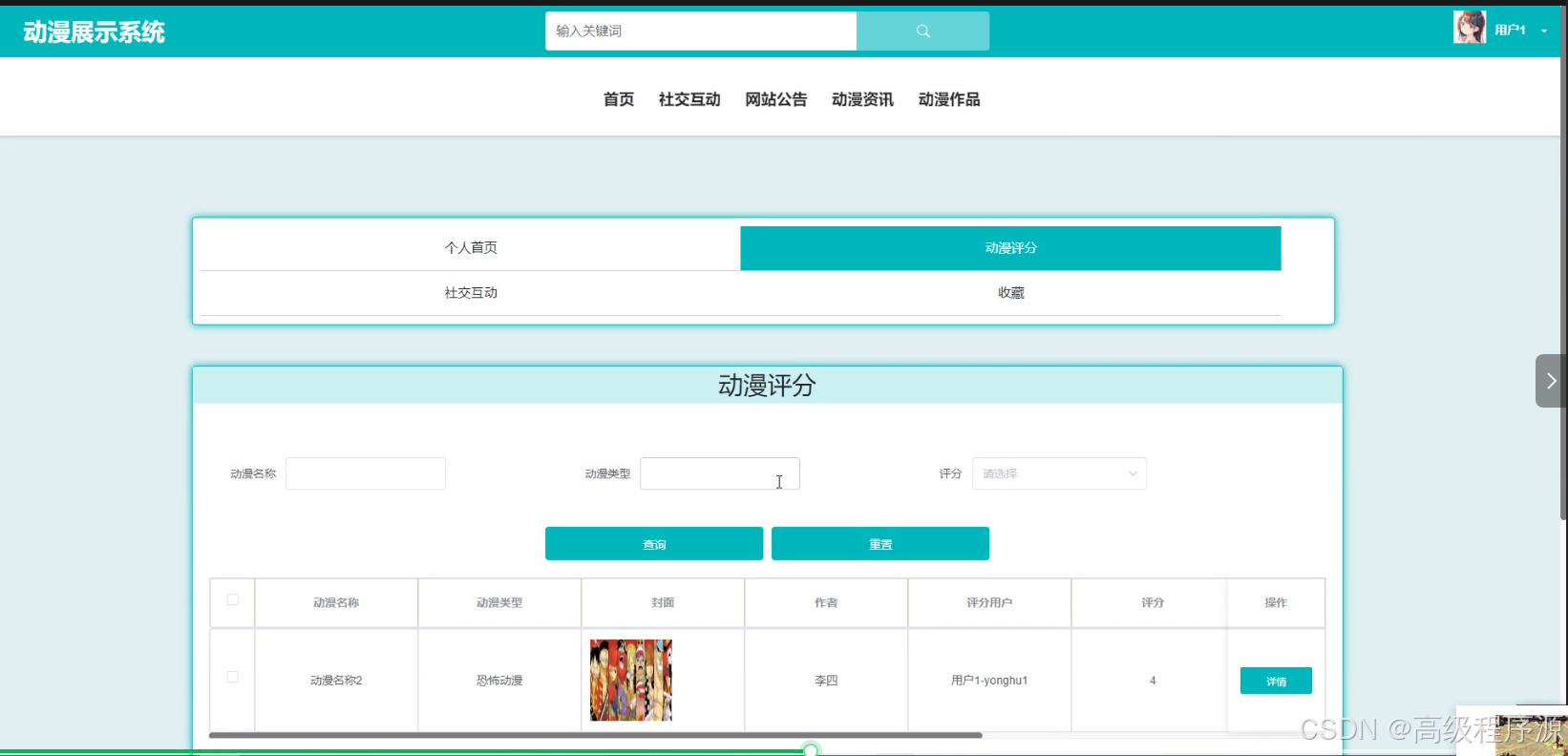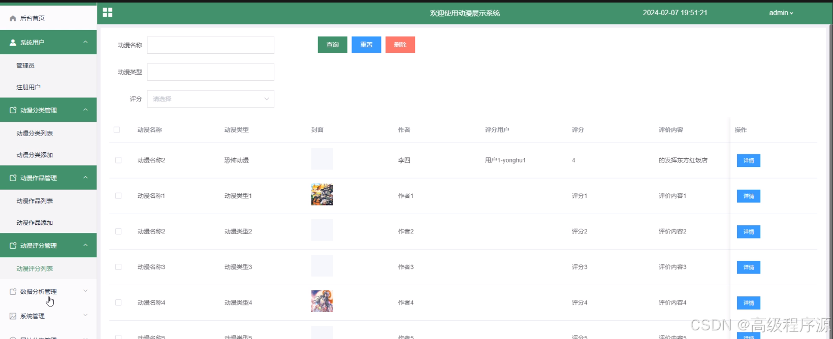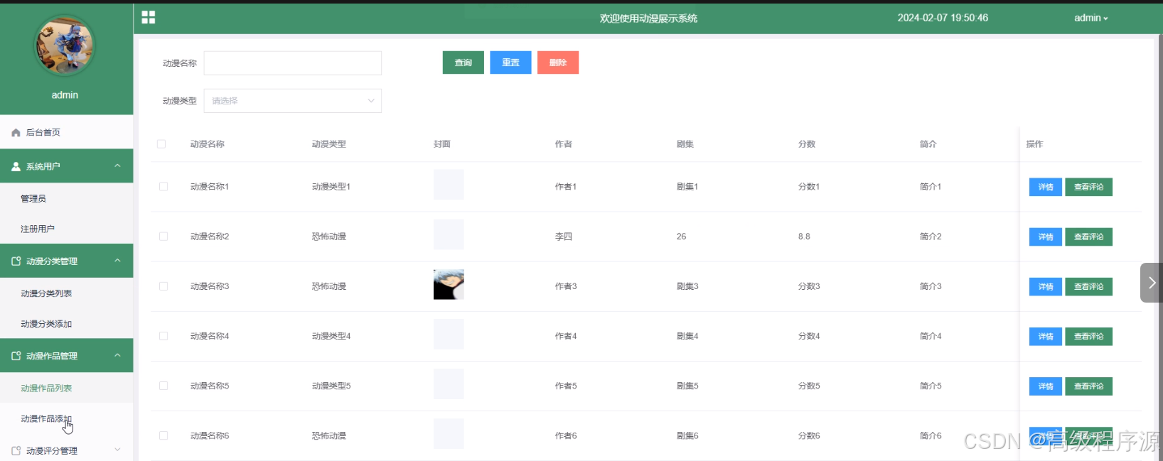 - 动漫作品管理:管理员可以查看动漫作品列表中某一作品详情和评分信息,可以对动漫作品信息进行查询、重置、添加和删除操作。