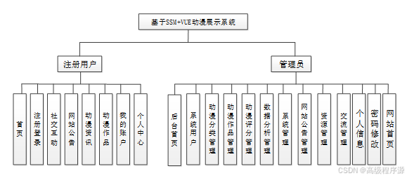 按照基于SSM+VUE动漫展示系统的角色,主要包括注册用户模块和管理员这两大功能模块,各模块功能内容如下: