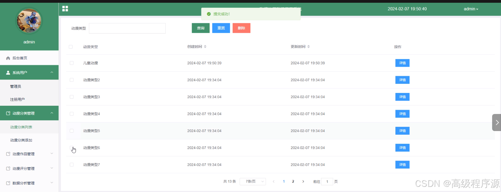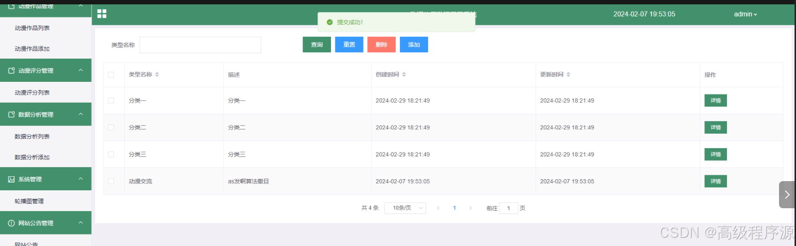 - 动漫分类管理:管理员可以对查看动漫分类列表中某一分类详情,可以对动漫分类信息进行查询、重置、添加和删除操作。