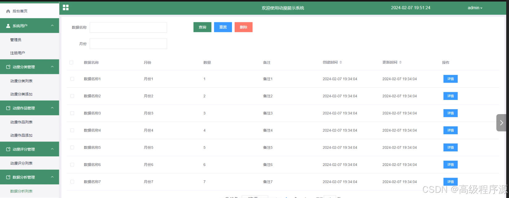 - 数据分析管理:管理员可以查看数据分析列表中某一数据详情,可以对数据分析信息进行查询、重置、添加和删除操作。