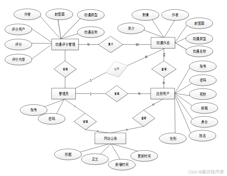 下面是整个基于SSM+VUE动漫展示系统中主要的数据库表总E-R实体关系图。