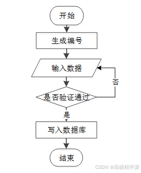 用户成功登入系统后就能够实现增加数据的操作,增加数据的编号由系统生成,用户不能随意填写,除了编号以外,其他增加信息用户自己填写,填写后的信息需经过系统验证,验证通过后即可完成数据新增,数据新增的流程图如下图2-1所示。