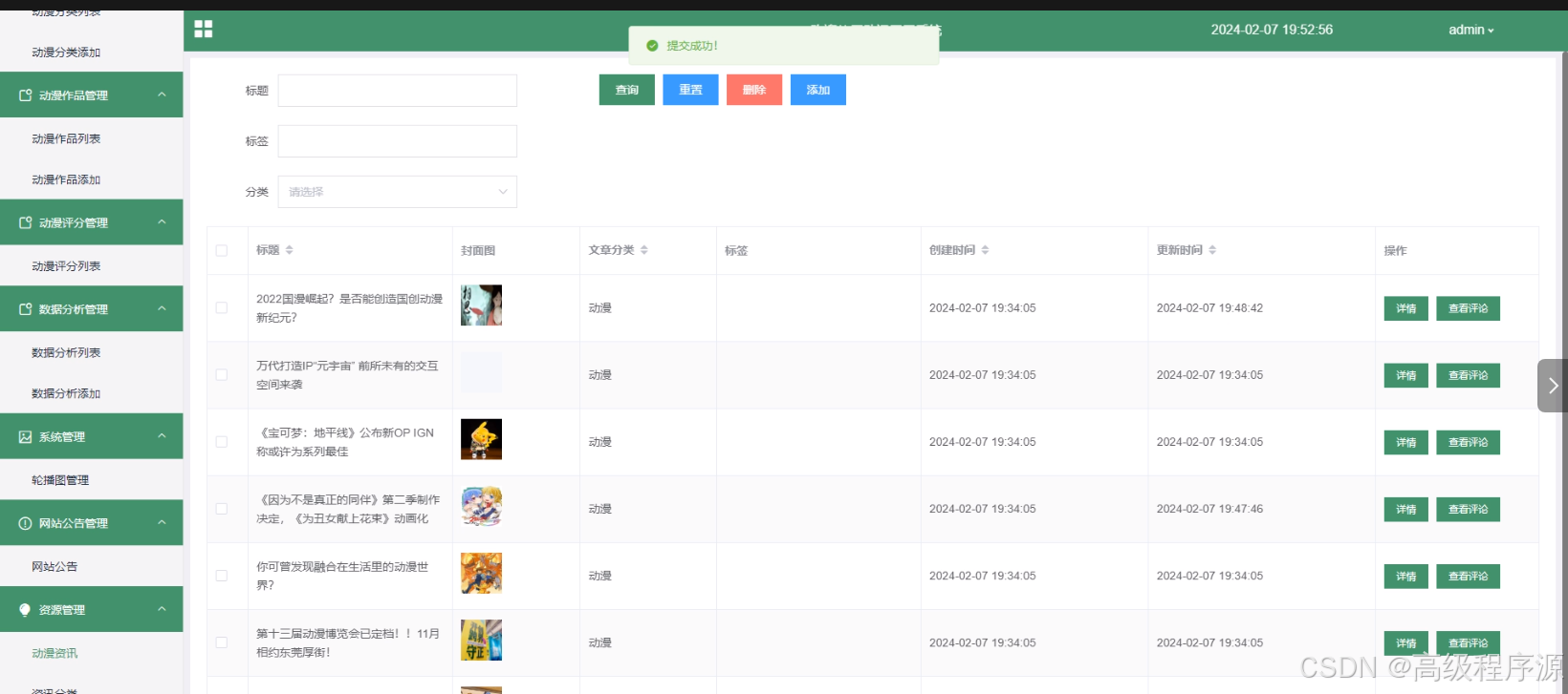 - 资源管理:管理员可以对动漫资讯、资讯分类信息进行查询、重置、添加和删除操作。