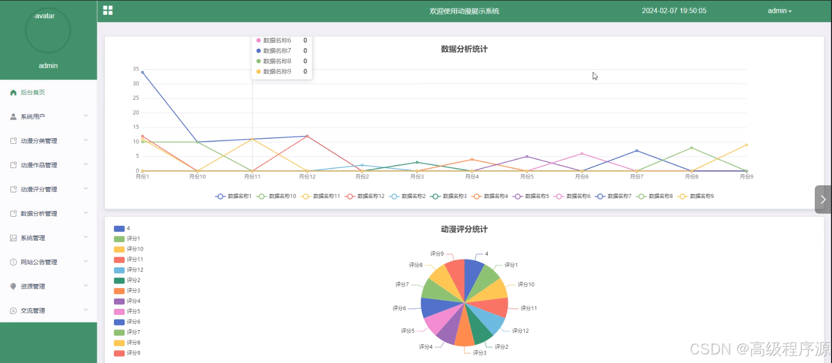 - 后台首页:管理员可以管理员可以查看后台主页展示的数据分析和动漫评分统计图。