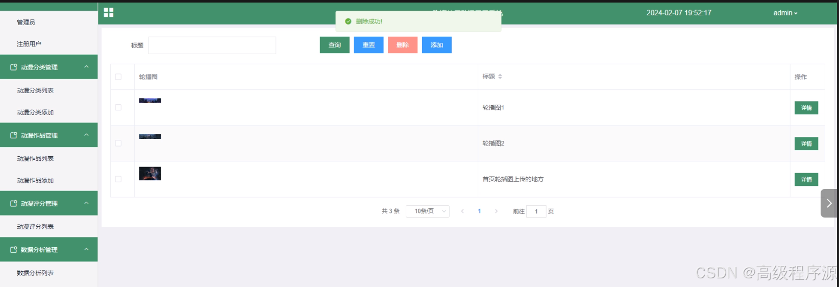 - 系统管理:管理员可以对系统轮播图信息进行查询、重置、添加和删除操作。