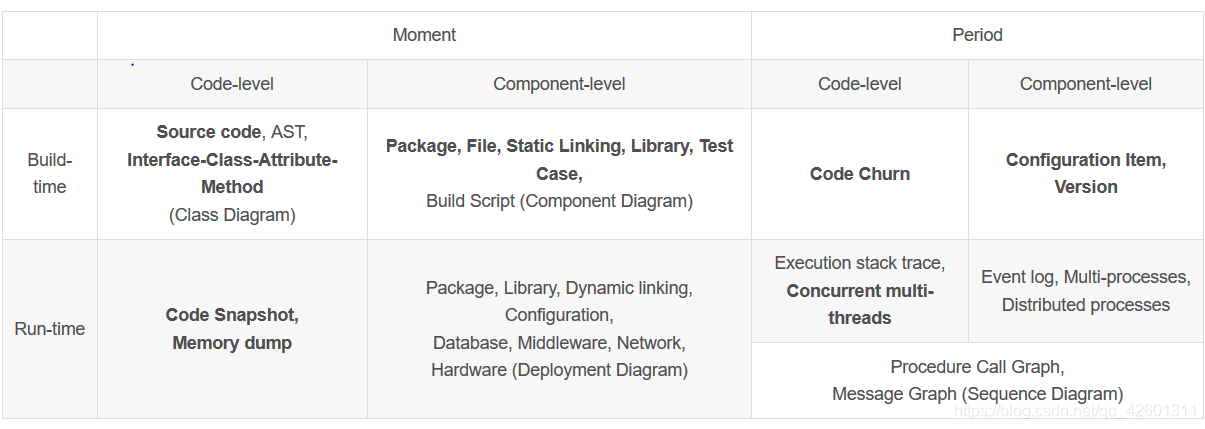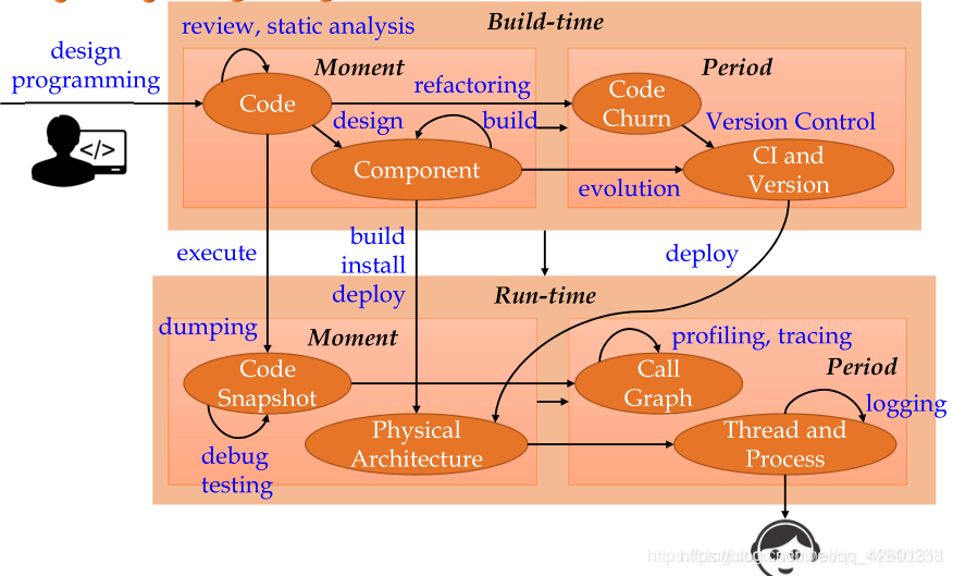 从无到有,写出了代码,就进入了Build-time维度,开始只是单个的没有任何联系的代码文件,所以是在moment+Code-level维度,此时随着时间的推移,代码删删改改,就属于Period+Code-level了,而代码越写越多成为了一个包,甚至形成了一个库,于是就属于moment+Component-level维度了,但是随着时间的推移,你的库文件由于需求的变化发生了变化,所以就属于Period+Component-level。代码写好了,投入运行,进入Run-time维度,观察的如果是某一句代码的执行后结果,那就是moment+Code-level维度,但如果看的是代码执行的轨迹,那就是Period+Code-level维度,而如果看的是一个库文件的连接情况等,那就是moment+Component-level维度了,如果看的是线程或进程的执行过程,也就是通过日志等手段查看一段时间内系统都做了什么事情,那么就是Period+Component-level了。