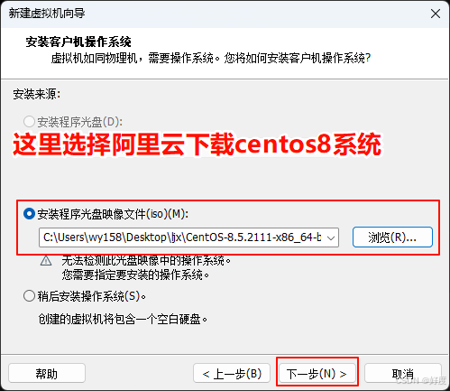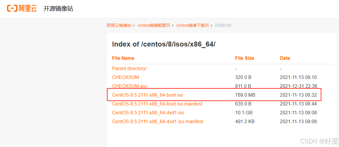 2. 下载centos系统,在阿里云上下载,速度比较快,地址:https://mirrors.aliyun.com/centos/8/isos/x86_64/?spm=a2c6h.25603864.0.0.12631ce4LRWY1z