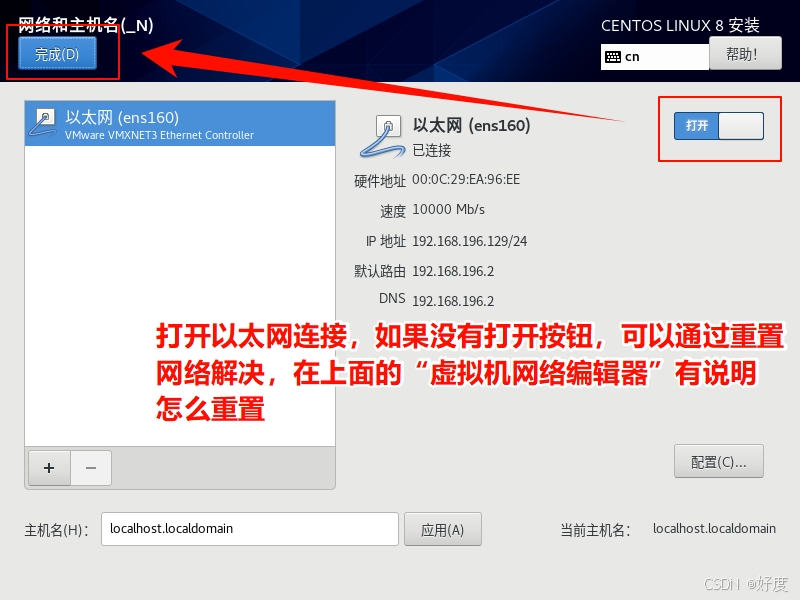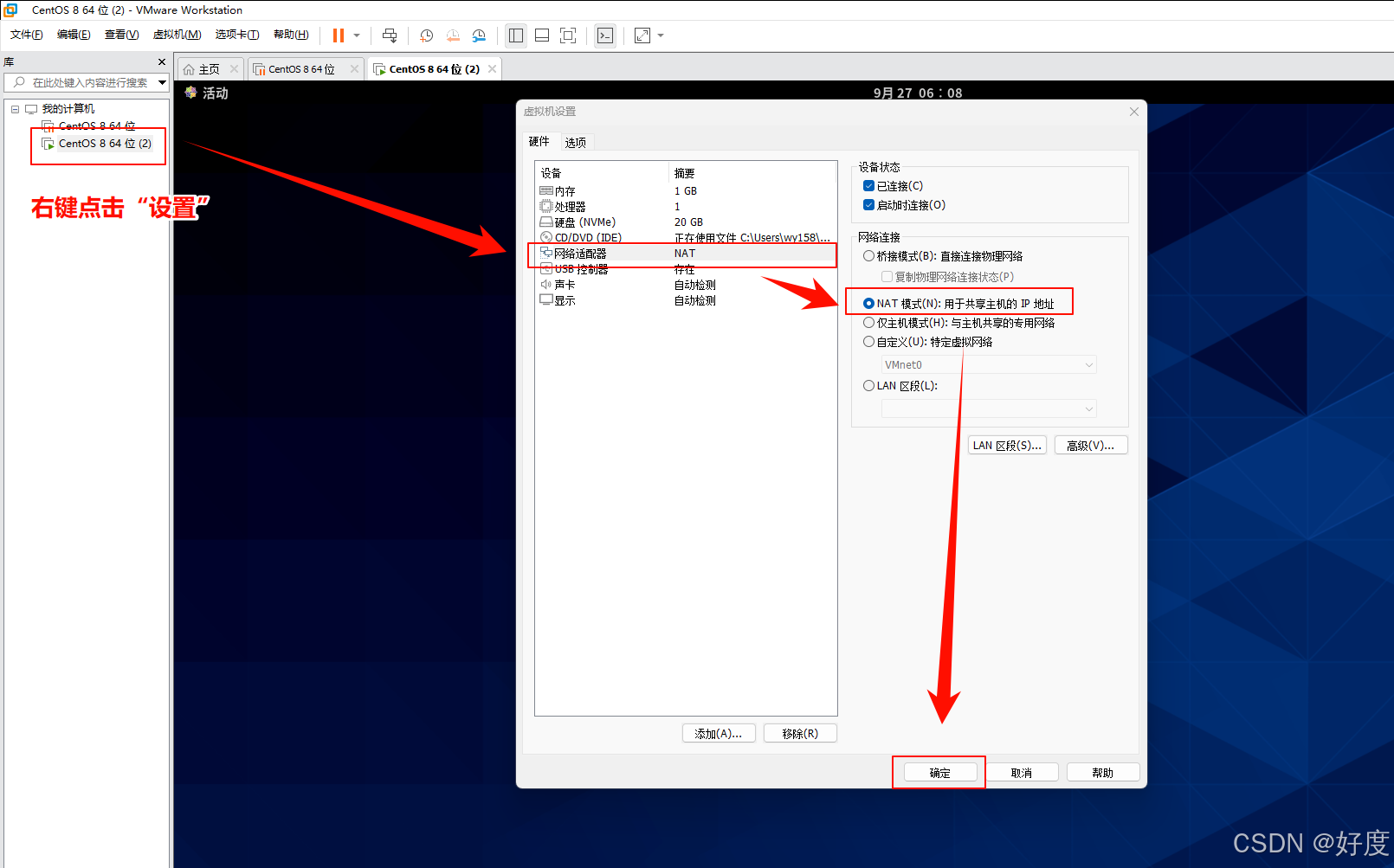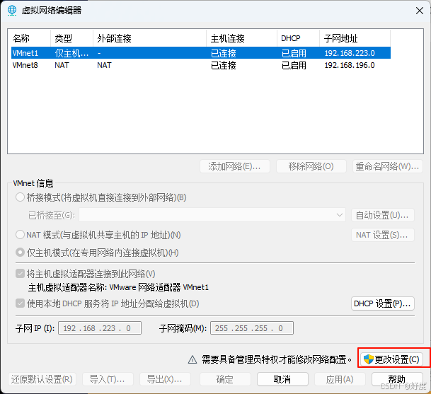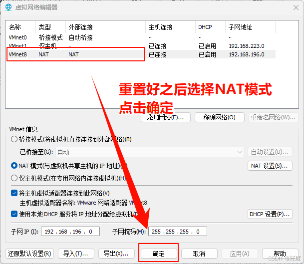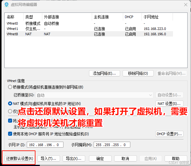 这里需要打开“虚拟网络编辑器”重置网络,否则后续centos系统可能无法打开以太网